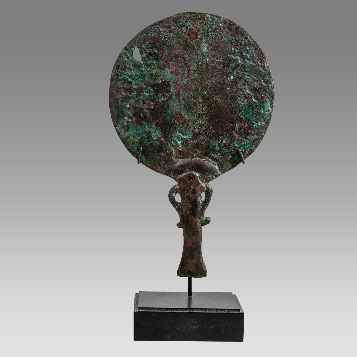 Ancient Egyptian Bronze Mirror with Isis Handle Late Period, ca. 700-30 B.C. Size 10 1/4 inches high + stand. 6 3/8 inches wide. (26 cm) Fine cast bronze large mirror with handle depicting Isis. Custom base. Provenance: Private New York city Egyptologist collection acquired from Arte Primitivo Lot number 252