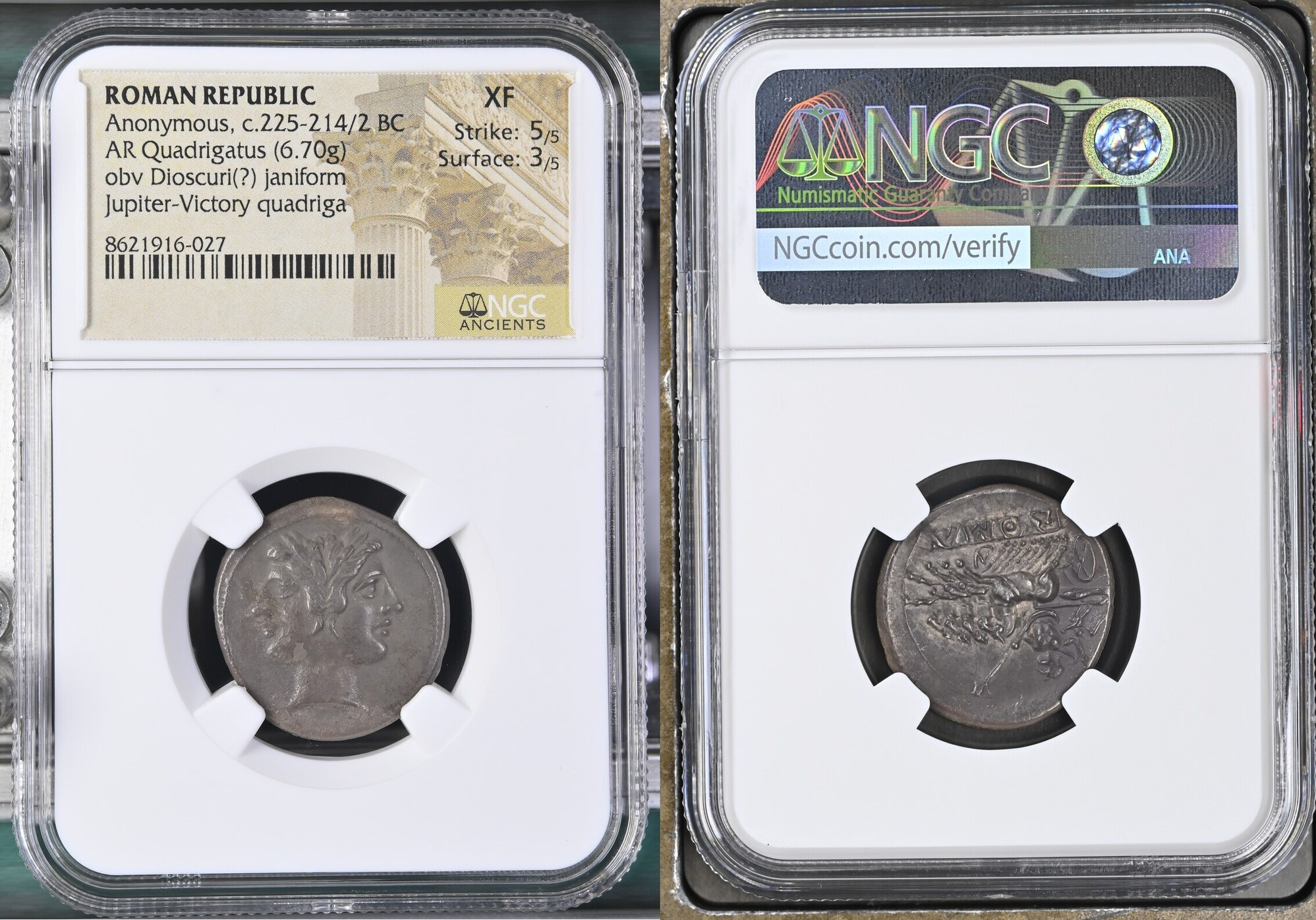 Anonymous (ca. 225-214/2 BC). AR didrachm or quadrigatus (6.70 gm, 6h). NGC XF. Uncertain mint. Laureate janiform heads of the Dioscuri (?), with joined sideburns; dotted border / Jupiter, hurling thunderbolt with right hand, transverse scepter surmounted by lotus in left, in quadriga galloping right driven by Victory; ROMA incuse on raised tablet below. Crawford 28/3-30/1 (didrachms). Sydenham 64.
