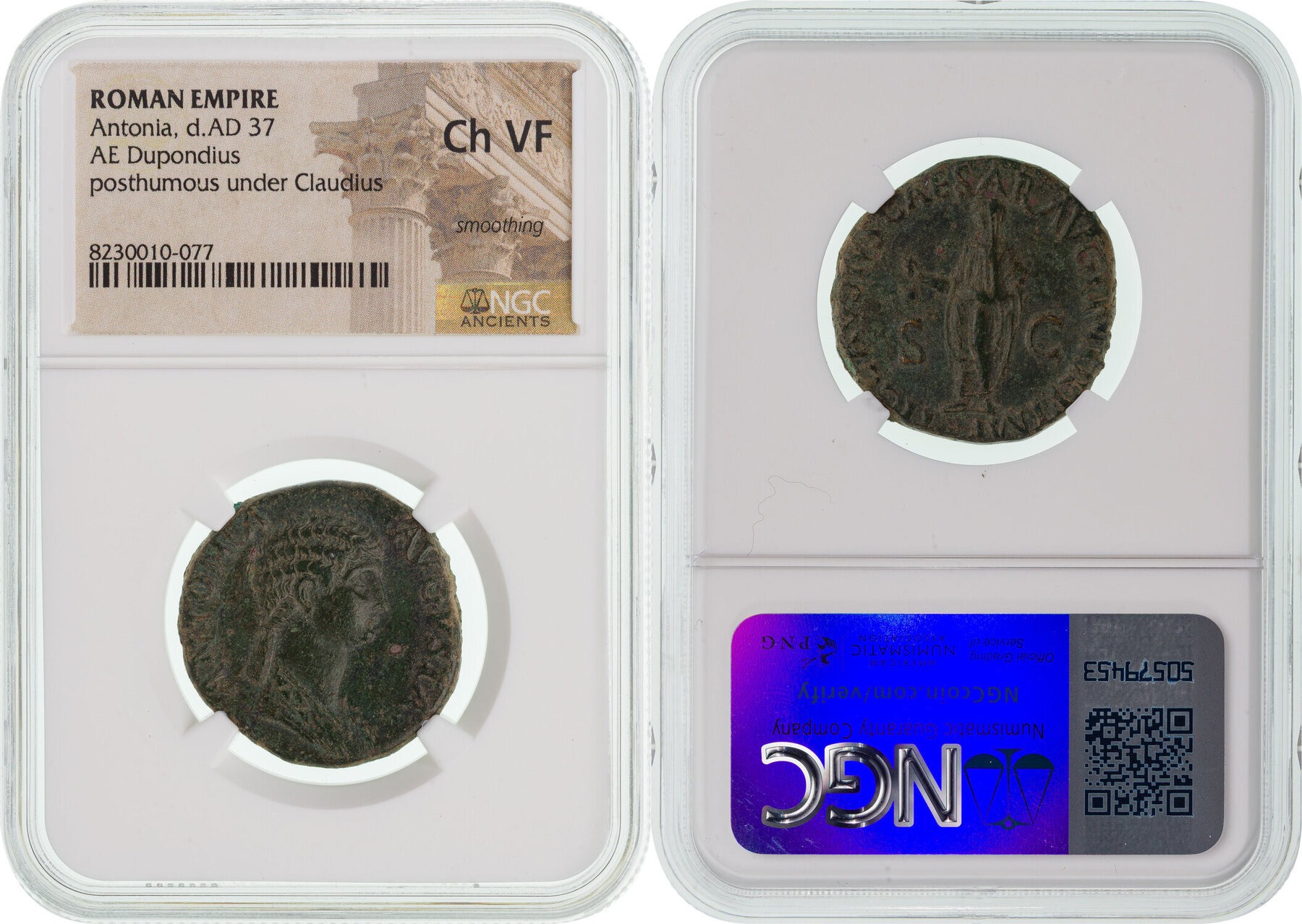 Antonia Minor. Augusta, AD 37 and 41. Æ Dupondius. Rome mint. Struck under Claudius, AD 41-42. Draped bust of Antonia right / Claudius, veiled and togate, standing left, holding simpulum. RIC I 92 (Claudius); von Kaenel Type 59. NGC choice VF.