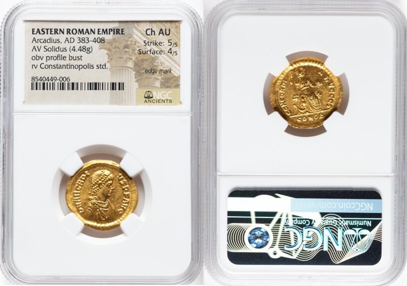 Arcadius, Eastern Roman Empire (AD 383-408). AV solidus (21mm, 4.48 gm, 5h). NGC Choice AU 5/5 – 4/5, edge mark. Constantinople, 6th officina, AD 378-383. D N ARCADI-VS P F AVG, pearl-diademed, draped, and cuirassed bust of Arcadius right, seen from front / CONCORDI-A AVGGG S, Constantinopolis seated facing on throne ornamented with lion heads, helmeted head right, right foot on prow, grounded scepter in right hand, globe in outstretched left hand; CONOB in exergue. RIC IX 46f.