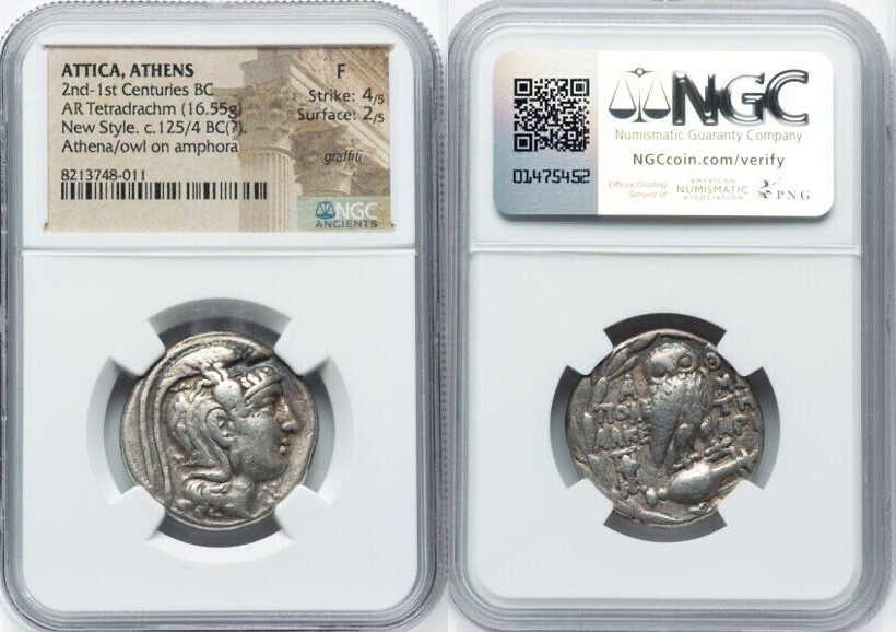 ATTICA. Athens. Ca. 2nd-1st centuries BC. AR tetradrachm (26mm, 16.55 gm, 11h). NGC Fine 4/5 – 2/5, graffiti. New Style coinage, ca. 125/4 BC, 9th month, Polemon, Alcetes, and Aris-, magistrates. Head of Athena right wearing triple-crested Attic helmet, ornamented with leaping Pegasus above upturned cheek flap, vine scroll on bowl, protomes of four horses on visor / A-ΘE / ΠOΛE-MΩN / AΛKE-THΣ / ΑΡΙΣ, owl standing facing on overturned amphora engraved with Θ (month); tripod in left field, ΣΩ (engraver) below, all within olive wreath. HGC 4, 1602. Thompson 471d (157/6 BC).