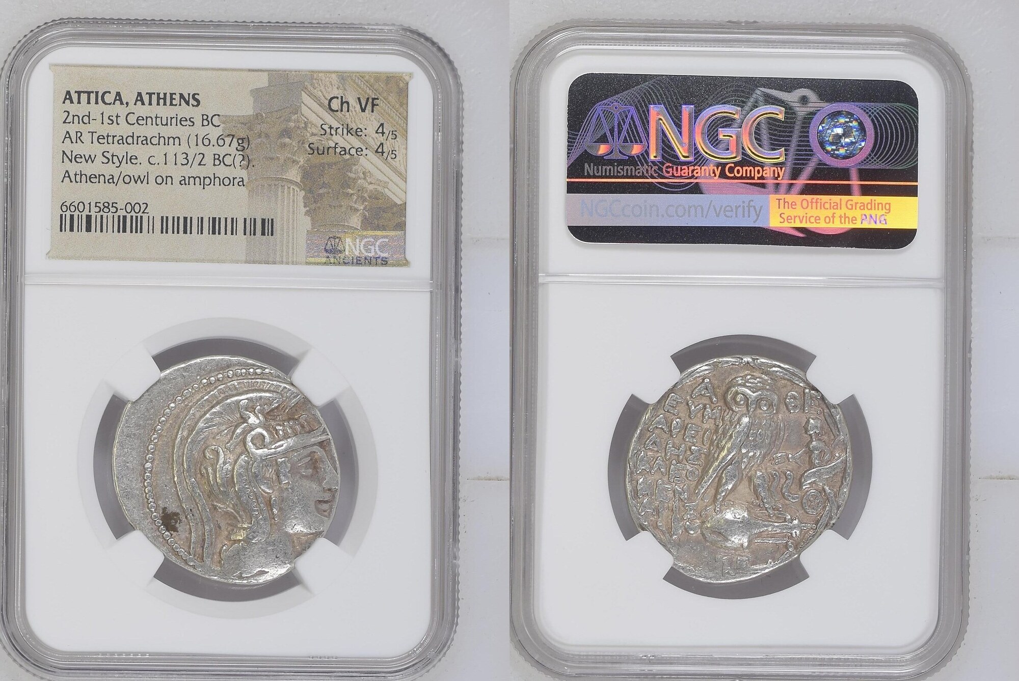 ATTICA, Athens. Circa 165-42 BC. AR Tetradrachm (29mm, 16.67 g, 12h). New Style coinage. Eumareides, Kleomen–, and Aris–, magistrates. Struck 113/2 BC. Head of Athena Parthenos right, wearing single-pendant earring and triple crested Attic helmet decorated with Pegasos and floral pattern / Owl standing right, head facing, on amphora; magistrates’ names across field; to right, Tritpolemos driving biga of serpents left; [Γ or Z(?)] on amphora, [ΣΩ(?) below]; all within wreath. Cf. Thompson 678a (same obv. die); HGC 4, 1602. Toned. In NGC encapsulation 6601585-002, graded Ch VF, Strike: 4/5, Surface: 4/5.