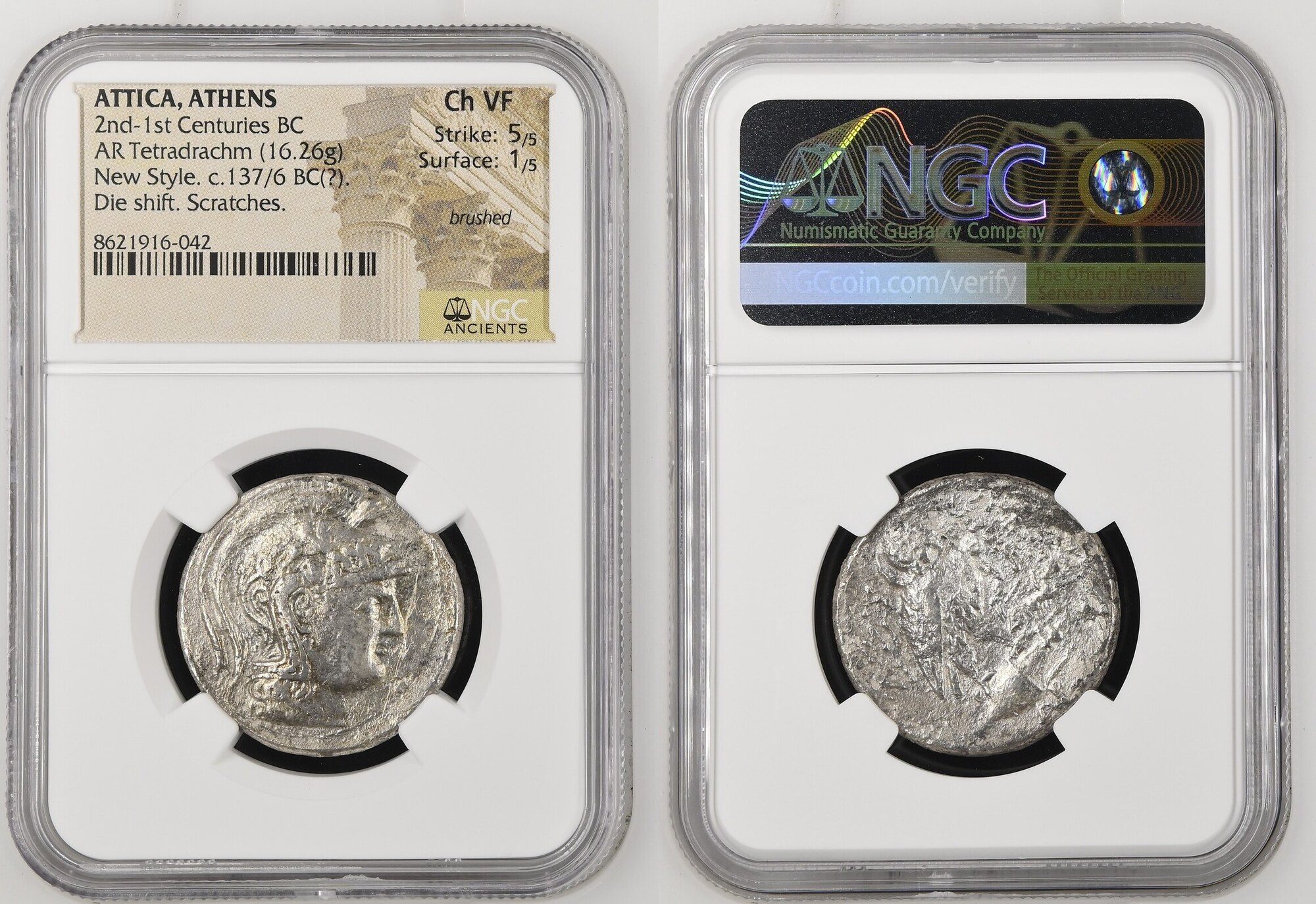 ATTICA, Athens. Circa 165-42 BC. AR Tetradrachm (28mm, 16.26 g, 11h). New Style coinage. Miki–, and Theophra–, magistrates. Struck 137/6 BC. Helmeted head of Athena Parthenos right / Owl standing right, head facing, on amphora; magistrates’ names in fields; to right, Nike driving fast quadriga right; [letter] on amphora, AP below; all within wreath. Cf. Thompson 315g; HGC 4, 1602. Bright, NGC Choice VF.