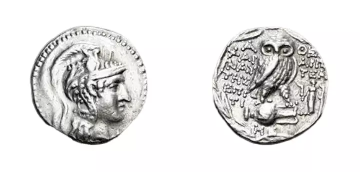 ATTICA, Athens. Circa 165-42 BC. AR Tetradrachm (29mm, 16.79 g, 12h). New Style coinage. Charinautes, Aristeas, and Epiti–, magistrates. Struck 112/1 BC. Helmeted head of Athena Parthenos right / Owl standing right, head facing, on amphora; magistrates’ names in fields; to right, Demeter(?) standing facing, holding two torches, retrograde Z on amphora, ME below; all within wreath. Thompson 690g (same obv. die); HGC 4, 1602. Struck with worn obverse die. VF.