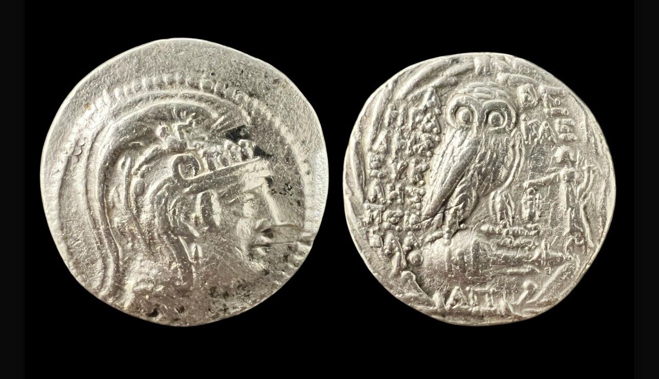 ATTICA, Athens. Circa 165-42 BC. AR Tetradrachm (31mm, 16.09 g, 12h). New Style coinage. Herakleides, Eukles-, and Askle-, magistrates. Struck 106/5 BC. Helmeted head of Athena Parthenos right / Owl standing right on amphora, head facing; magistrates’ names in fields; in right field, winged Tyche standing left, holding uncertain object over amphora and cradling cornucopia; B on amphora, EO below; all within wreath. Thompson 750a (same obv. die); HGC 4, 1602. VF.