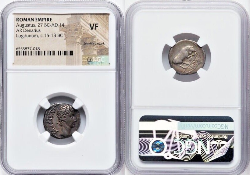 Augustus (27 BC-AD 14). AR denarius (18mm, 4h). NGC VF, bankers mark. Lugdunum, ca. 15-13 BC. AVGVSTVS-DIVI•F, bare head of Augustus right / IMP•X, bull charging right, head lowered, thrashing tail. RIC I 167a.