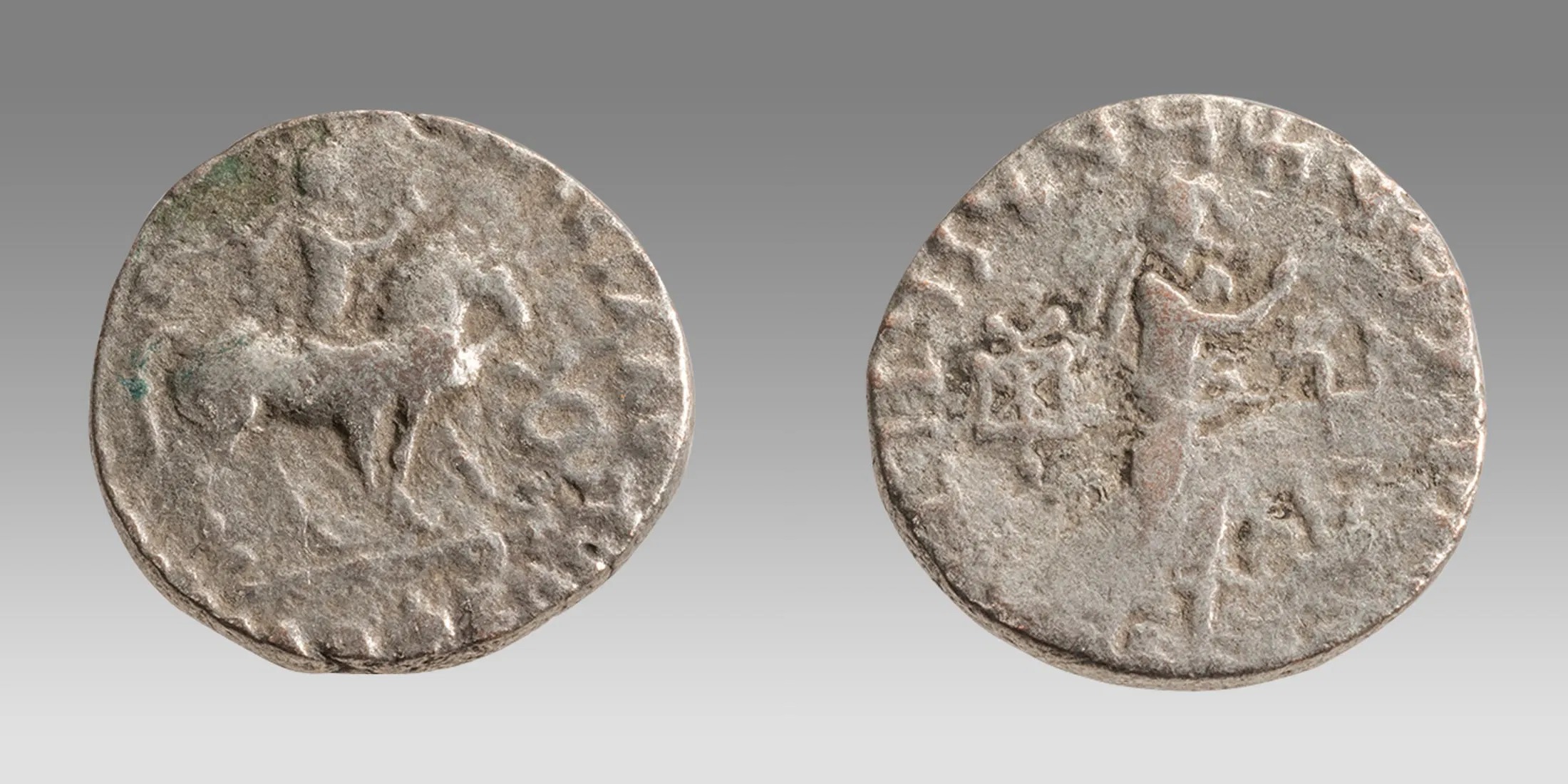 Azes II silver tetradrachm, 35 BC – 5 AD. Size 23 mm, weight 8.51 grams. One of the three men of the bible. King on horseback holding whip; la in Kharosthi to right / Athena standing right, holding spear and shield, monograms in field. Very Fine