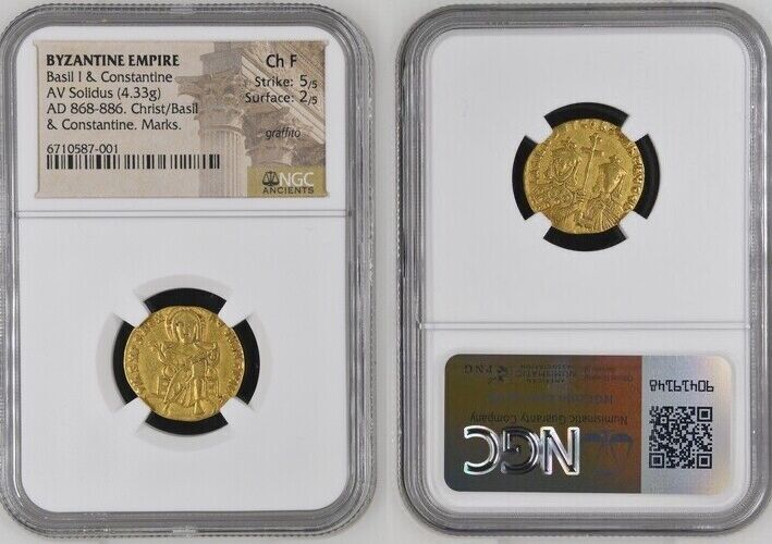 BASIL I with CONSTANTINE, 867-886. AV Solidus (4.33 gms), Constantinople Mint, 868-879. NGC Ch F, Strike: 5/5 Surface: 2/5. Marks, Graffiti.