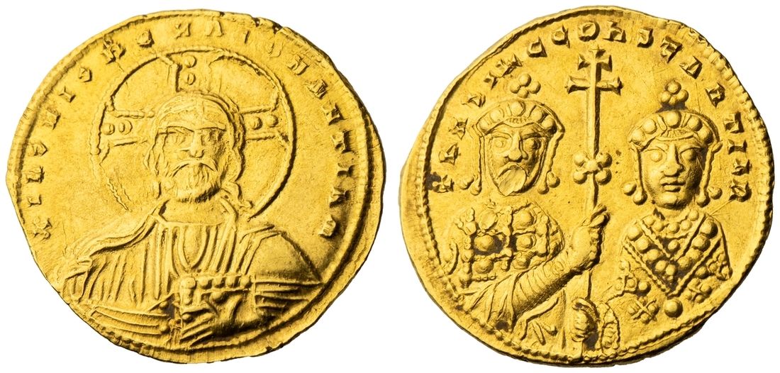 Byzantine Empire, Basil II, Bulgaroktonos (796-1025), AV Tetarteron Nomisma, + IhS REX REGNANTIhM, bust of Christ facing, wearing nimbus cruciger with two pellets in each limb, pallium and colobium, raising right hand in benediction, holding book of Gospels in left hand, rev. + bASIL C CONSTANTI b R, facing busts of Basil and Constantine, on left and right respectively, Basil with short bead and Constantine beardless, both crowned, Basil wearing loros of square pattern, Constantine wearing V-shaped overgarment ornamented with pearls, holding patriarchal cross between them, x on shaft of cross, 4.23g (SB 1806), Very fine