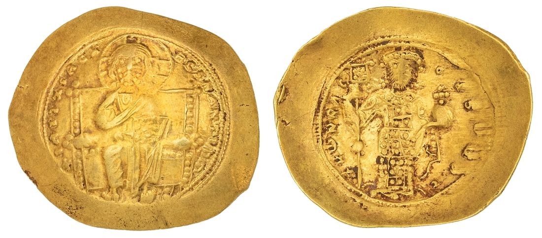 Byzantine Empire, Constantine X Ducas (1059-1067), AV Histamenon Nomisma (scyphate), + IhS IXS ERX REGNANTIhM, legend bungled, Christ seated facing, on throned with upright arms, wearing nimbus cruciger, pallium and colobium, raising right hand in benediction, holding book of Gospels in left hand, double border, rev. + KWN RAC O DOVKAC, Constantine standing facing on footstool, wearing crown, saccos and loros, holding labarum with single pellet in shaft and globus cruciger, double border, 4.31g (SB 1847), beautifully toned, very fine