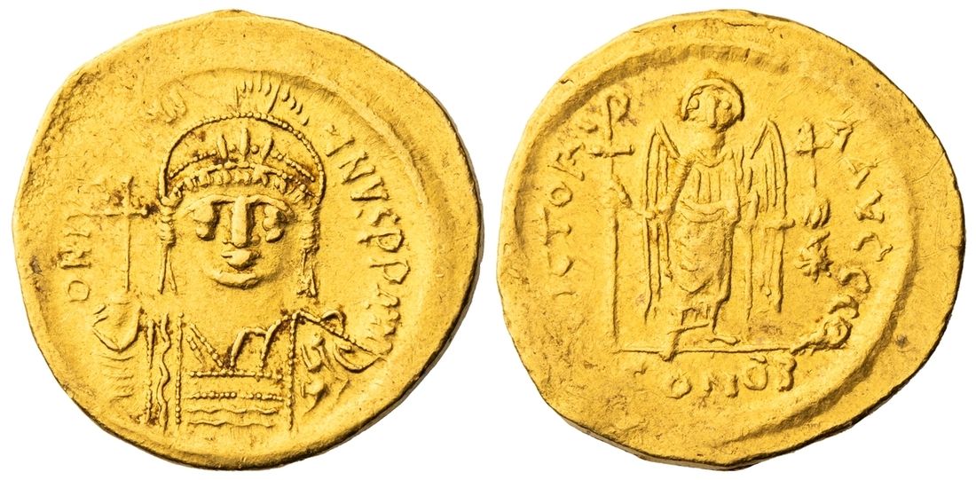 Byzantine Empire, Justinian I, ‘the Great’ (527-565), AV Solidus, D N IVSTINIANVS P P AVG, helmeted and cuirassed bust facing, holding globus cruciger and shield, rev. VICTORIA AVGGG [theta], angel standing facing, holding long linear cross and globus cruciger, star to right, CONOB in exergue, 4.42g (SB 140), good fine