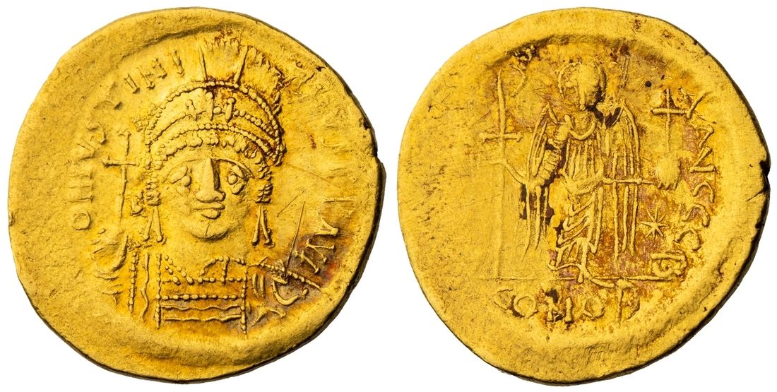 Byzantine Empire, Justinian I, ‘the Great’ (527-565), AV Solidus, ND IVSTINIANVS P P AVG, helmeted and cuirassed bust facing, rev. [VICTORI]A AVGGG B, angel standing facing, holding staurogram and globus cruciger, CONOB in exergue, 4.39g (SB 140), soft edges, scratches and deposits, fine