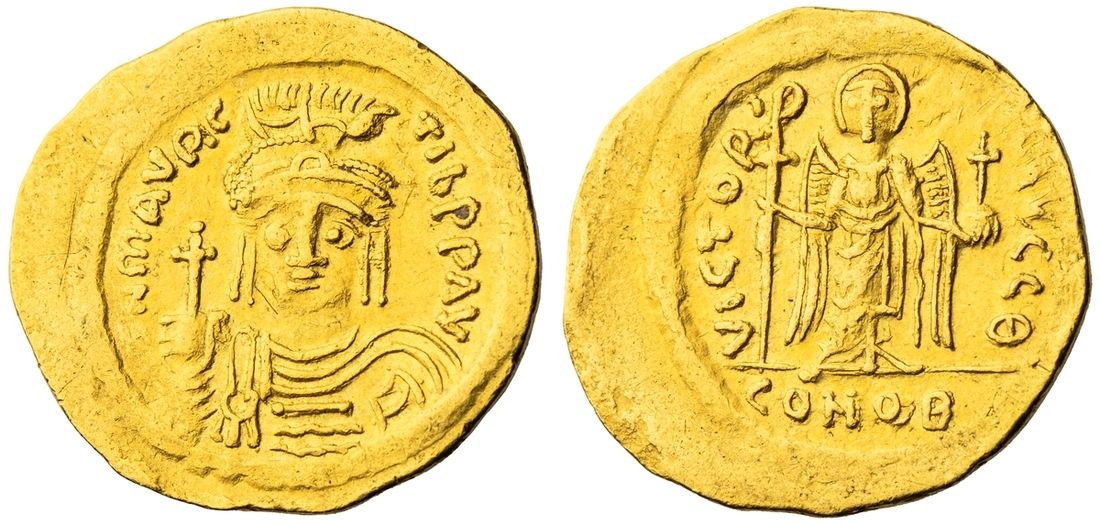 Byzantine Empire, Maurice Tiberius (582-602), AV Solidus, [O]N MAVRC TIB PP AV, draped and cuirassed bust facing, wearing plumed helmet, holding globus cruciger, rev. VICTORI[A] AVGG [theta], angel standing facing, holding long staff surmounted by staurogram and globus cruciger, CONOB in exergue, 4.38g (SB 478), off-centre on a broad flan, good fine