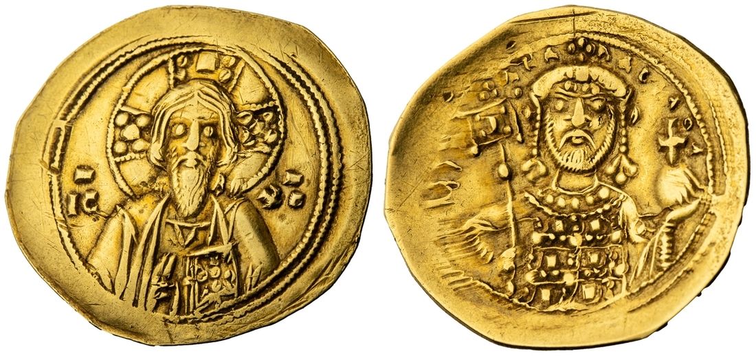 Byzantine Empire, Michael VII Ducas (1071-1078), Electrum Histamenon Nomisma (scyphate), bust of Christ facing, raising right hand in benediction, holding book of Gospels in left hand, IC-XC with macrons in left and right fields, double border, rev. MIXAHL RAC[I]A O D, facing bust, bearded, wearing crown and loros, holding labarum with pellet on shaft and globus cruciger, double border, 3.11g (SB 1868), good fine