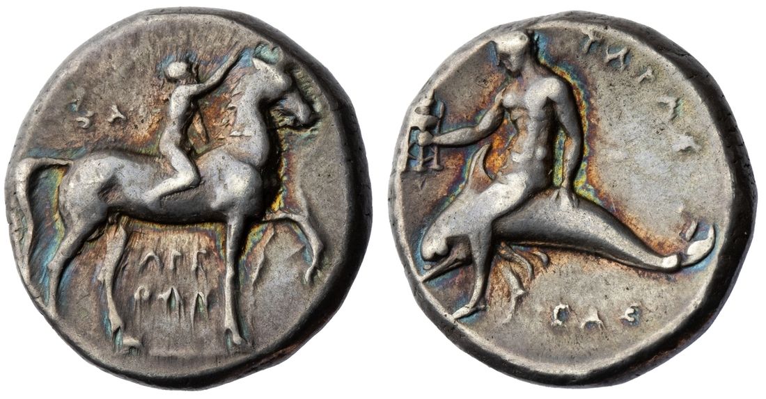 Calabria, Tarentum, AR Nomos, Arethon, Sa… and Cas…, magistrates, struck c. 281-272 BC, youth riding horse, standing right, raising right hand and crowning horse’s head, SA above, ARE/THON below, rev. TARAS, Taras riding dolphin left, holding tripod in outstretched right hand, CAS below, 7.87g (Vlasto 666-7; SNG ANS 1046; HN Italy, 957), toned, very fine