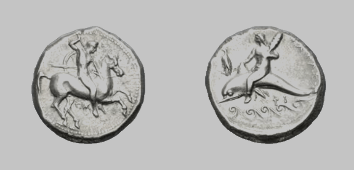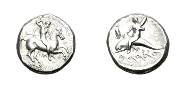 CALABRIA, Tarentum. Circa 290-281 BC. AR Nomos (20mm, 7.74 g, 1h). Warrior, nude, holding shield and two spears, preparing to cast a third, on horse rearing right; ΣIM below / Phalanthos, nude, holding distaff, riding dolphin left; to left, eagle standing left; ΦI and waves below. Fischer-Bossert Group 78b, 1077 (V406/R831); Vlasto 576–7; HN Italy 933; SNG ANS 982 (same dies); SNG Lockett 182 (same dies); BMC 234 (same dies); Weber 591 (same dies). Faintly toned, some die wear, light cleaning scratches. Good VF.