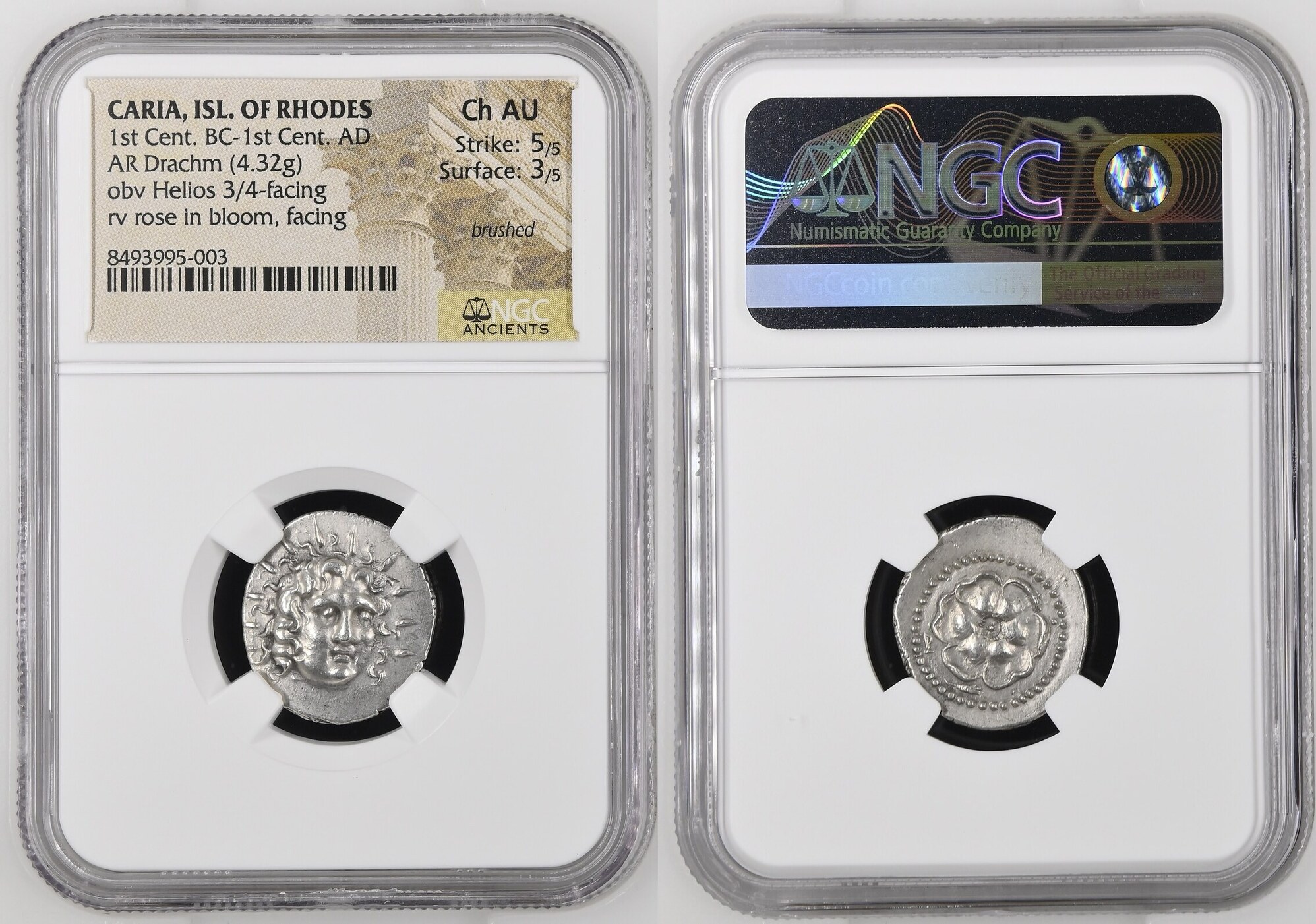 CARIA. Islands off Caria. Rhodes. AR Drachm (4.32 gms), ca. 88 B.C.-A.D. 14. NGC Ch AU, Strike: 5/5 Surface: 3/5. Brushed.
