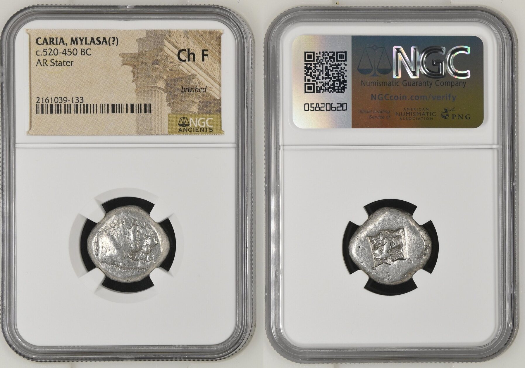 CARIA. Uncertain mint. Ca. 520-450 BC. AR stater (20mm). NGC Choice Fine, brushed. Forepart of lion right with one extended foreleg / Incuse square with irregular interior surfaces. SNG Kayhan -. HN online 2610.