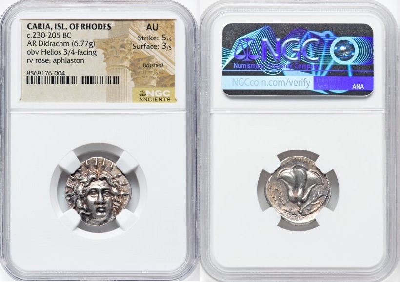 CARIAN ISLANDS. Rhodes. Ca. 230-205 BC. AR didrachm (20mm, 6.77 gm, 12h). NGC AU 5/5 – 3/5, brushed. Aristocritus, magistrate. Radiate head of Helios facing slightly to right / ΑΡΙΣΤΟΚΡΙΤΟΣ, rose with bud to right; Ρ-Ο flanking stem, aphlaston to left. HGC 6, 1440. Ashton 219. BMC 138. SNG Keckman 546. Splashes of indigo toning.