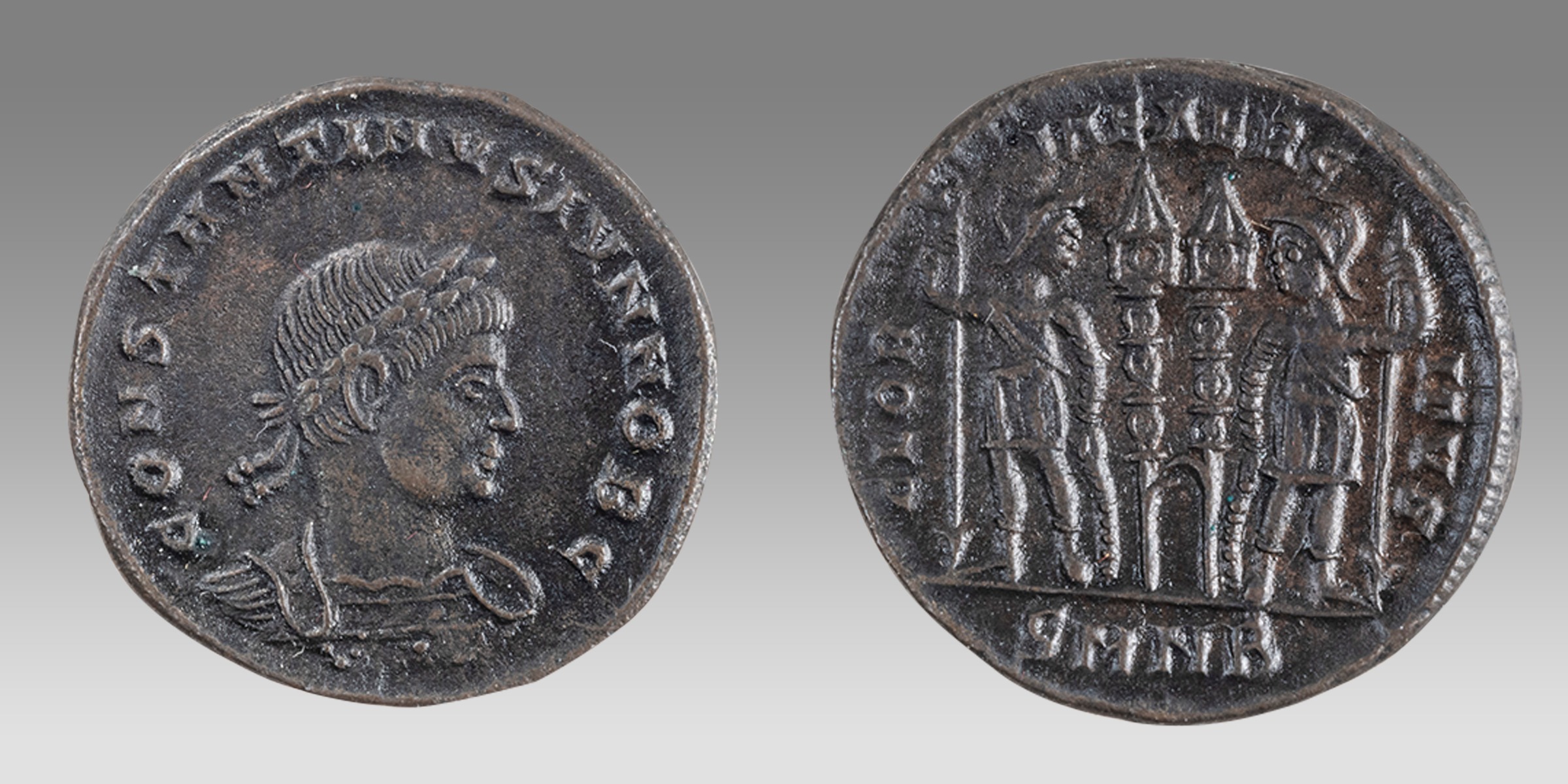 Constantine II. As Caesar, AD 316-337. Æ Follis (18mm, 2.67 g, 6h). Antioch mint, 5th officina. Struck AD 330-333/35. Laureate and cuirassed bust right / Two signa between two soldiers, each holding spear and shield; SMNЄ. RIC VII 87. EF,