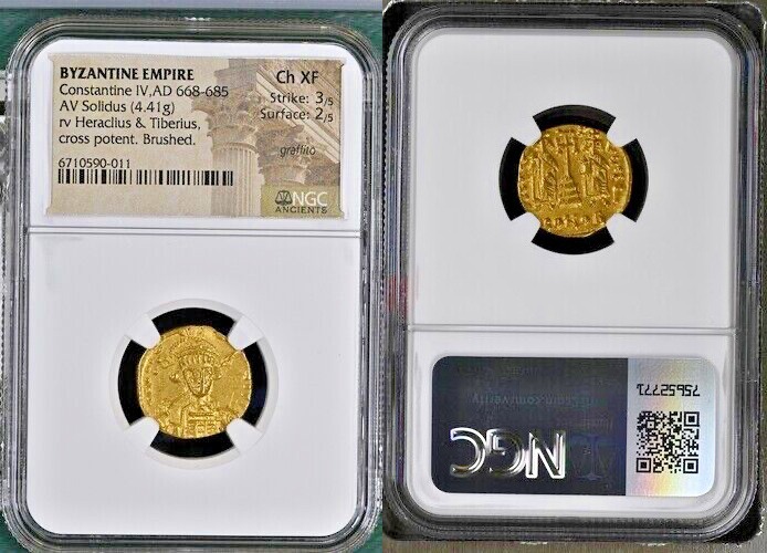 CONSTANTINE IV with HERACLIUS and TIBERIUS, 668-685. AV Solidus (4.41 gms), Constantinople Mint, 3rd Officina, ca. 674-681. NGC Ch EF, Strike: 3/5 Surface: 2/5. Brushed, Graffito.