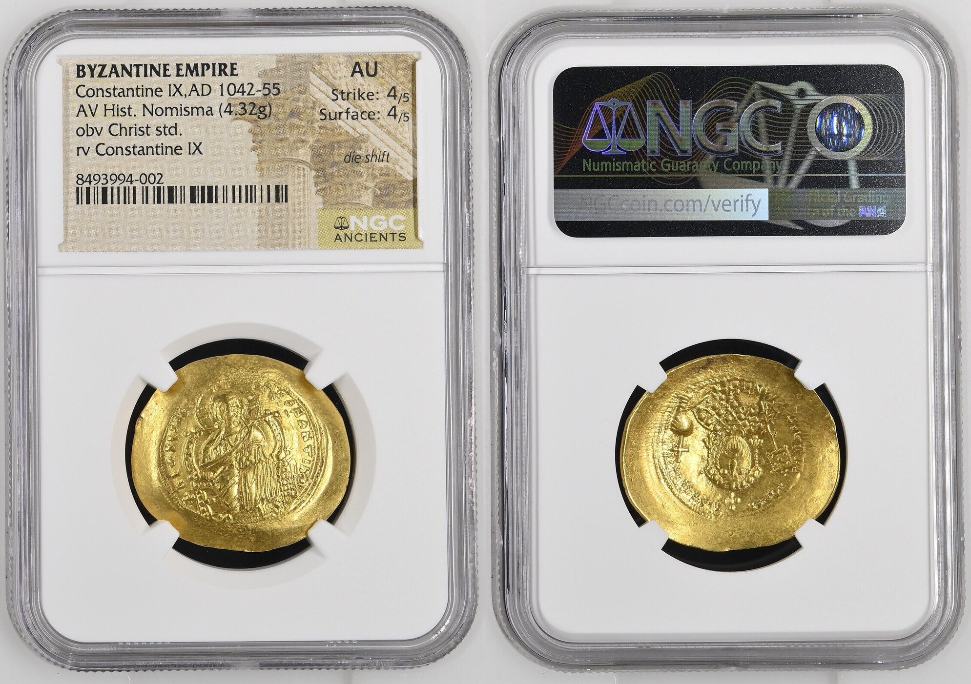 CONSTANTINE IX, 1042-1055. AV Histamenon Nomisma (4.32 gms), Constantinople Mint. NGC AU, Strike: 4/5 Surface: 4/5. Die Shift.