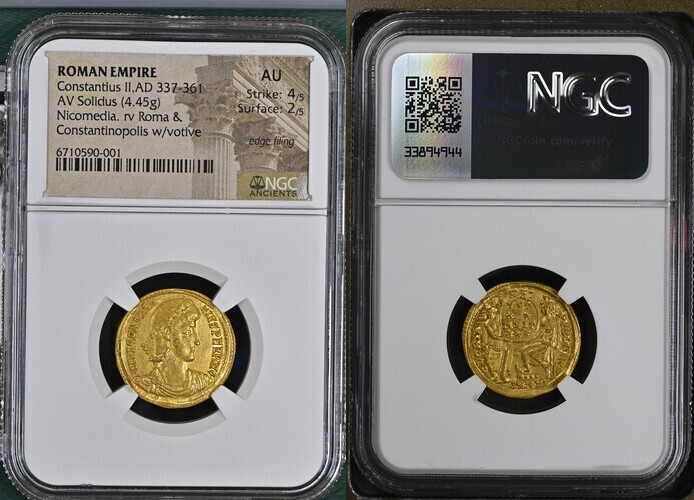 CONSTANTIUS II, A.D. 337-361. AV Solidus (4.45 gms), Nicomedia Mint, 6th Officina, A.D. 340-351. NGC AU, Strike: 4/5 Surface: 2/5. Edge Filing.