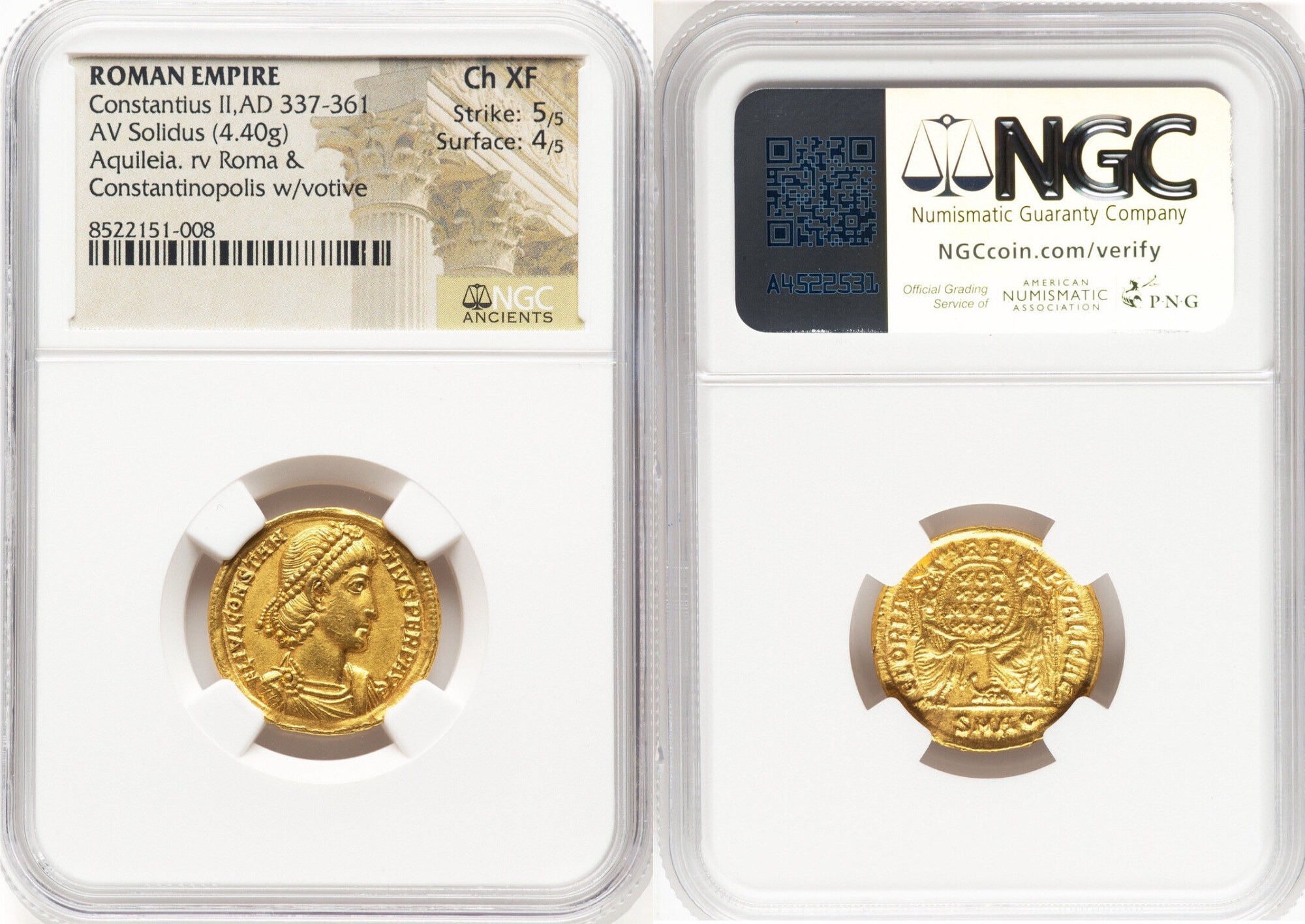 Constantius II, as Augustus (AD 337-361). AV solidus (21mm, 4.40 gm, 12h). NGC Choice XF 5/5 – 4/5. Aquileia, AD September 352-6 November 355. FL IVL CONSTAN-TIVS PERP AVG, pearl-diademed, draped, and cuirassed bust of Constantius II right, seen from front / GLORIA-REI-PVBLICAE, Roma seated facing (on left), spear in left hand, and Constantinopolis seated left (on right), scepter in left hand, right foot on prow, jointly holding with their right hands between them shield inscribed with VOT / XXX / MVLT / XXXX; SMAQ in exergue. RIC VIII 179.