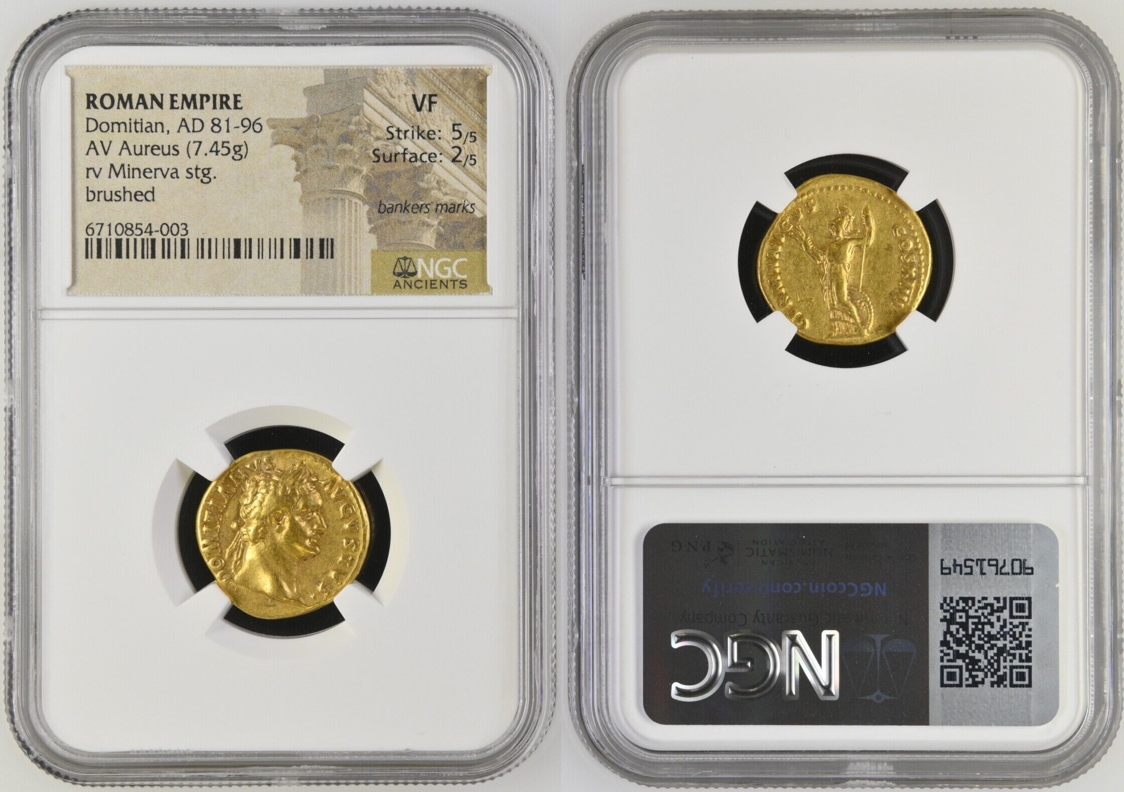 Domitian. AD 81-96. AV Aureus (7.45 g, 6h). Rome mint. Struck AD 90-91. Laureate head right / Minerva standing left, holding thunderbolt and spear; shield set on ground at feet. NGC VF.