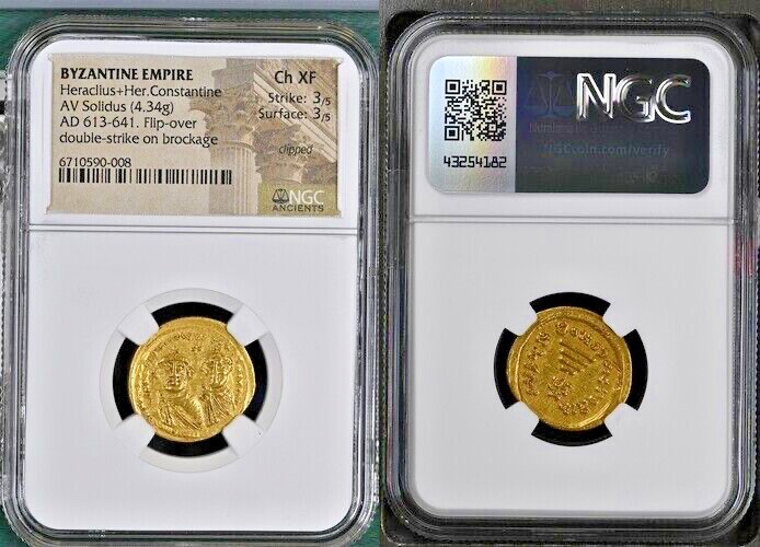 HERACLIUS with HERACLIUS CONSTANTINE, 610-641. AV Solidus (4.34 gms), Constantinople Mint, 7th Officina, 629-632. NGC Ch EF, Strike: 3/5 Surface: 3/5. Flip-over Double-Strike on Brockage, Clipped.