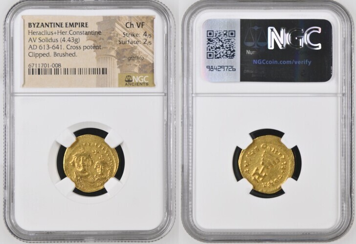 HERACLIUS with HERACLIUS CONSTANTINE, 610-641. AV Solidus (4.43 gms), Constantinople mint, 8th Officina, ca. 616-625. NGC Ch VF, Strike: 4/5 Surface: 2/5. Clipped, Brushed, Graffito.