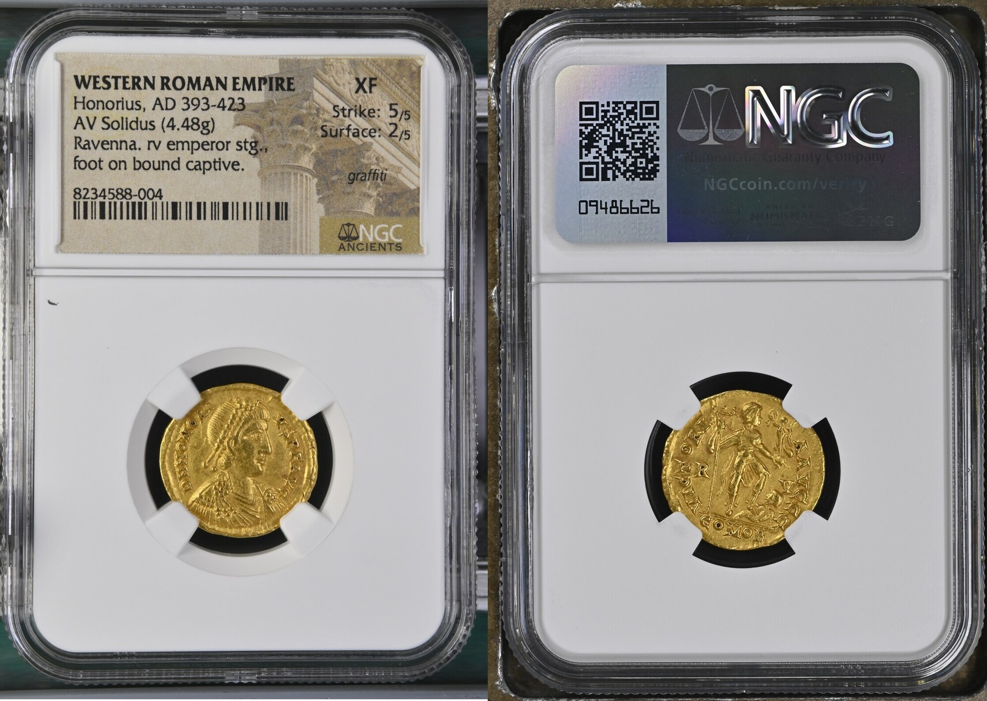 Honorius, Western Roman Empire (AD 393-423). AV solidus (20mm, 4.48 gm, 1h). NGC XF 5/5 – 2/5, graffiti. Ravenna, ca. AD 402-403, AD 405-406. D N HONORI-VS P F AVG, pearl-diademed, draped, and cuirassed bust of Honorius right, seen from front / VICTORI-A AVGGG, Honorius standing facing, head right, in military attire, left foot on captive to right, grounded labarum in right hand, Victory standing left on globe in outstretched left hand; R-V across fields, COMOB in exergue. RIC X 1287.