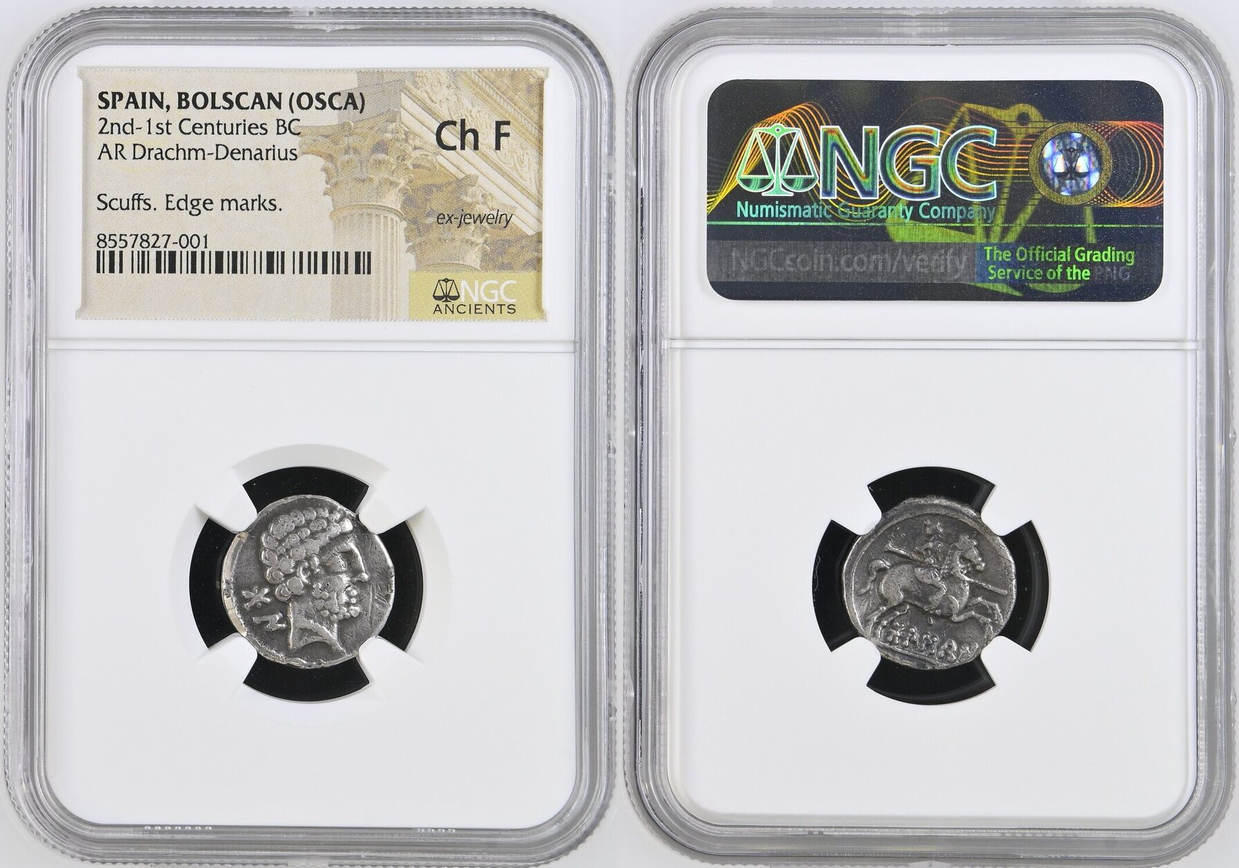 Iberia, Bolscan-Osca, AR Drachm-Denarius, c. 2nd-1st Centuries BC, bearded male head right, wearing pendant necklace, BON in Iberian script to left, rev. warrior on horseback galloping right with spear, BOLSCAN in Iberian script below (Villaronga pg. 211, 6; Burgos 1501), dark toning, scratch to obverse right field, ex-jewellery, fine, in NGC ‘Ancients’ holder, graded Choice Fine, “scuffs, edge-marks, ex-jewelry” (Cert. # 8557827-001)