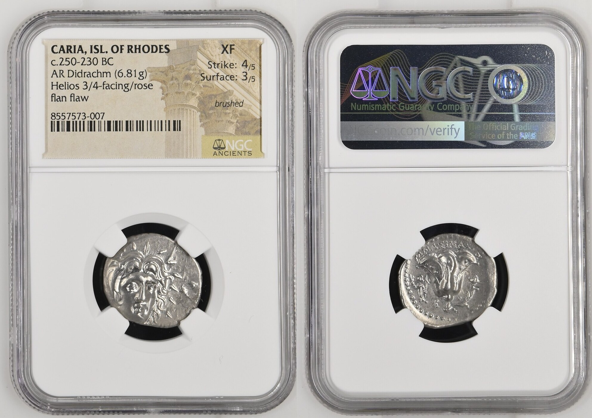 Islands of Caria, Rhodes, AR Didrachm, struck c. 250-230 BC, Agesidamos, magistrate, radiate head of Helios facing slightly right, rev. AGHSIDAMOY, rose in bloom, bud to right, P-O, Artemis running to left, 6.81g (Ashton 206 var.; SNG Keckman 535 var.), bright, brushed, obverse off-centre, very fine, in NGC ‘Ancients’ holder, graded XF [Strike: 4/5 Surface: 3/5] ~ “brushed” ~ (Cert. #8557573-007)