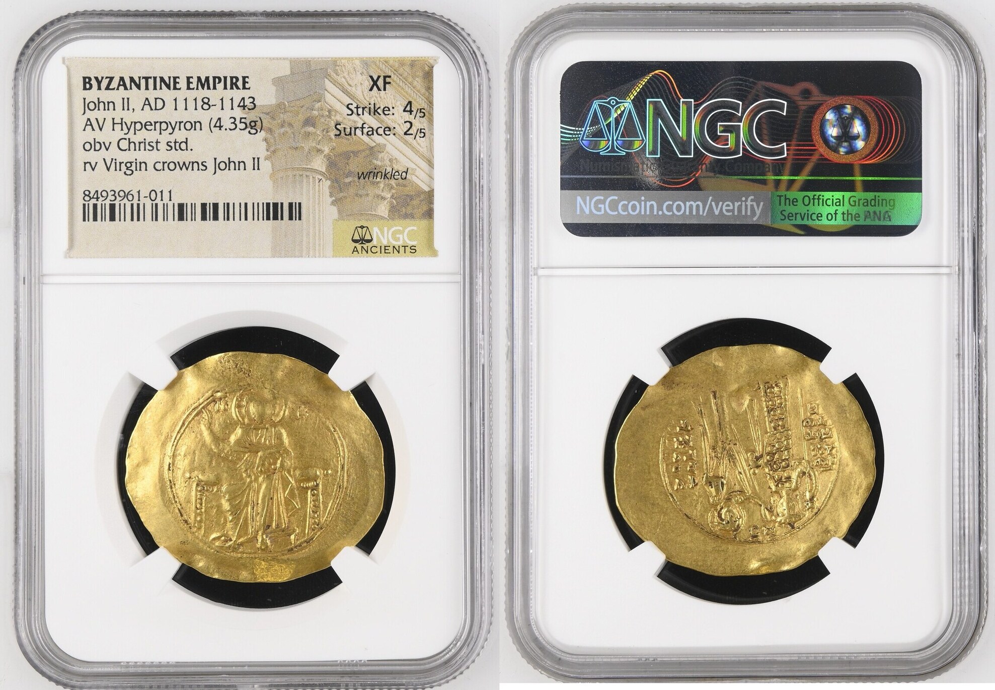 JOHN II, 1118-1143. AV Hyperpyron (4.35 gms), Constantinople Mint, ca. 1137-1143. NGC EF, Strike: 4/5 Surface: 2/5. Wrinkled.