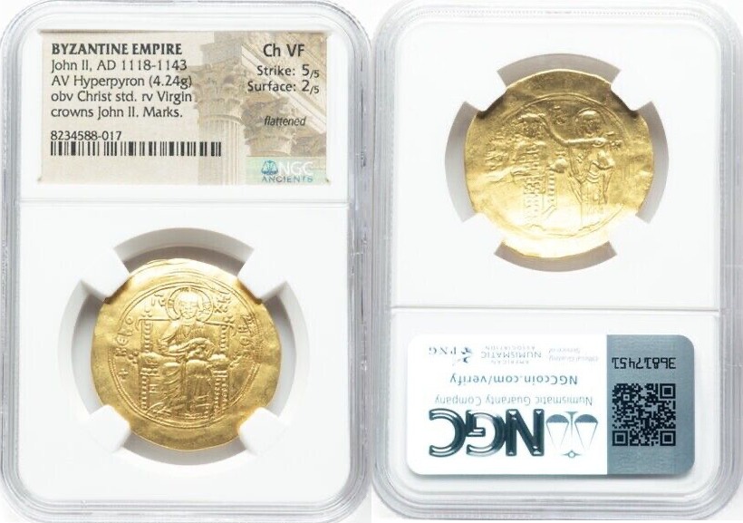 John II Comnenus (AD 1118-1143). AV hyperpyron (31mm, 4.24 gm, 6h). NGC Choice VF 5/5 – 2/5, flattened, marks. Constantinople. +K-Є RO-HΘЄI, Christ enthroned facing, wearing nimbus cruciger with single pellet in each arm, pallium and colobium, raising right hand in benediction, book of Gospels in left; IC-XC (barred) across fields, double border / IW / ΔЄC / ΠO / TH, The Virgin (on right), nimbate, standing facing, wearing pallium and maphorium, left hand raised in benediction, crowning with right hand John II (on left), standing facing, wearing divitision and loros, six pellets on sleeve, right hand on chest, globus cruciger in left; VΘ (barred) above, MHP (barred, and ligate) in right field. Sear 1940.