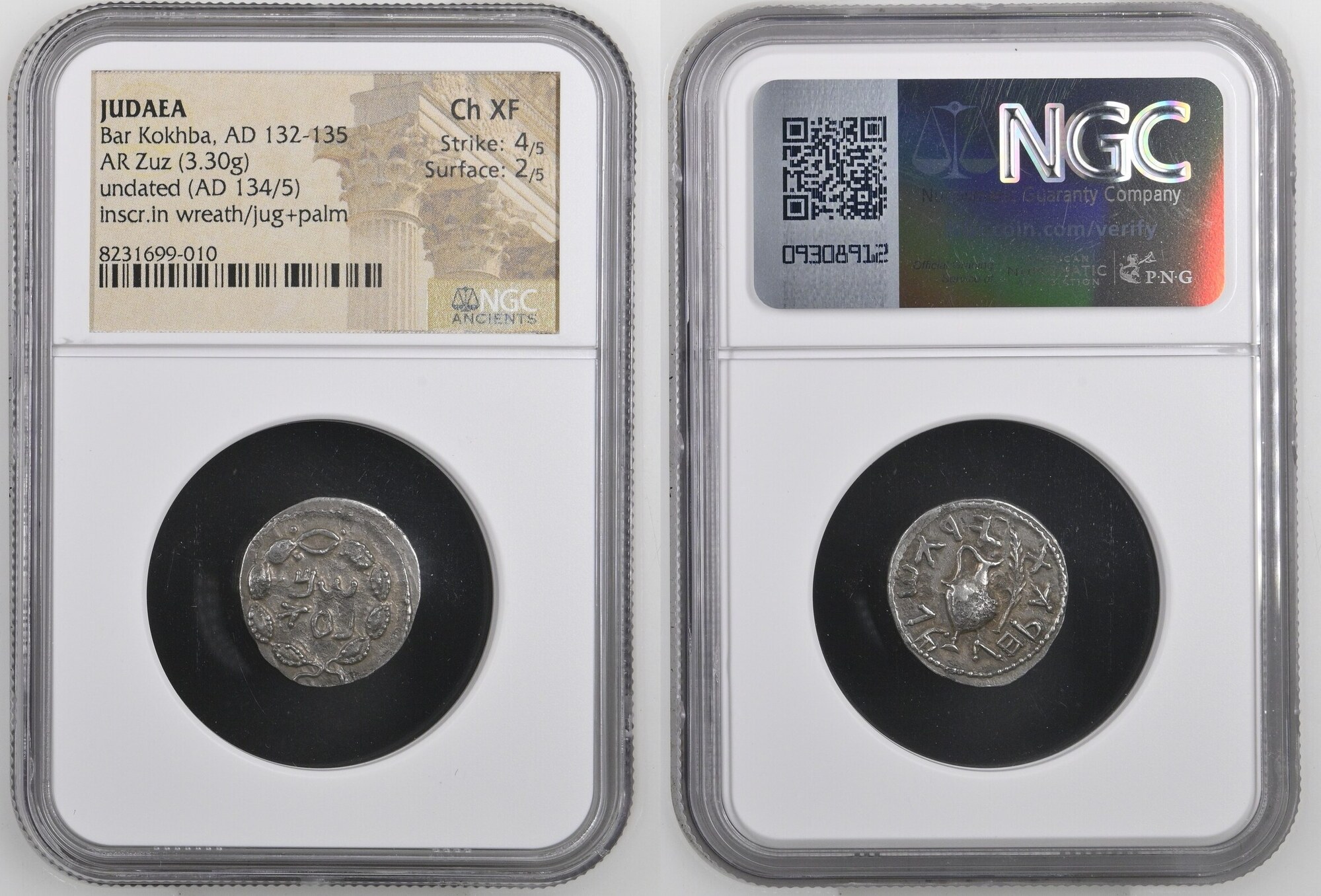 JUDAEA, Bar Kochba Revolt. 132-135 CE. AR Zuz – Denarius (17mm, 3.32 g, 1h). Undated, attributed to year 3 (134/5 CE). “Shim’on” in Hebrew irregularly distributed in two lines within wreath of thin branches wrapped around eight almonds / Fluted jug and branch; “For the freedom of Jerusalem” in Hebrew around. Mildenberg 85(015/ R52); Hendin 6449; Meshorer 283a; Bromberg 163 (same dies);