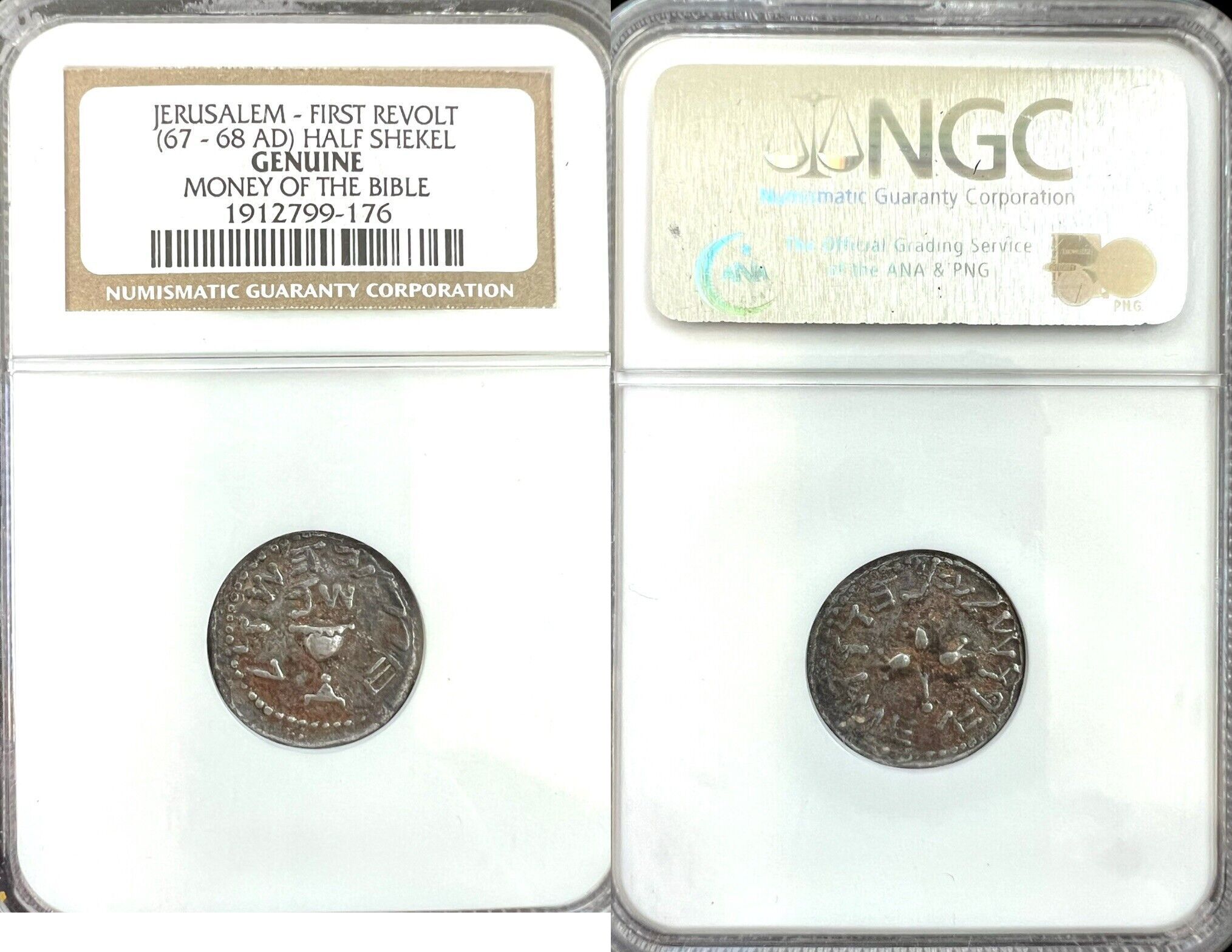 JUDAEA, Jewish War. 66-70 CE. AR Half Shekel. Jerusalem mint. Dated year 2 (67/8 CE). Omer cup; “Y[ear] 2” (date, in Hebrew) above,“Half Shekel” (in Hebrew) around / Sprig of three pomegranates; “Jerusalem the holy” (in Hebrew) around. Deutsch 21 (O2/R20); Kadman 9; Meshorer 195; Hendin 6388; Bromberg I 65; Shoshana I 20204 (same obv. die); Sofaer 9–10 (same obv. die); Spaer 170. Deeply toned NGC certified. Old holder around 2004 Pedigree money of the Bible. old east coast collection. Acquired from Tarshish gallery Jerusalem.