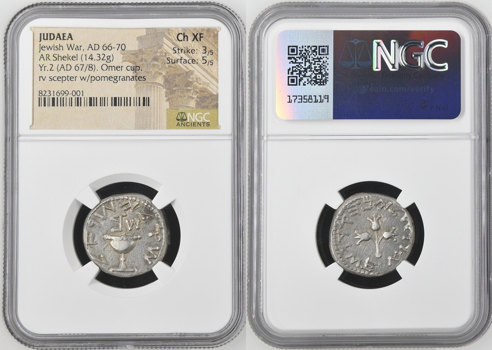 Jerusalem mint. Dated year 2 (67/8 CE). Omer cup; “Y[ear] 2” (in Hebrew) above, “Shekel of Israel” (in Hebrew) around / Sprig of three pomegranates; “Jerusalem the holy” (in Hebrew) around. Deutsch 4 (01/R4); Kadman 8; Hendin 6388; Meshorer 193; Bromberg | 63 (same dies); Shoshana | 20202-3; Sofaer 7-8; Spaer 167-8. Even gray tone with some golden hues, die break on obverse. Near EF.