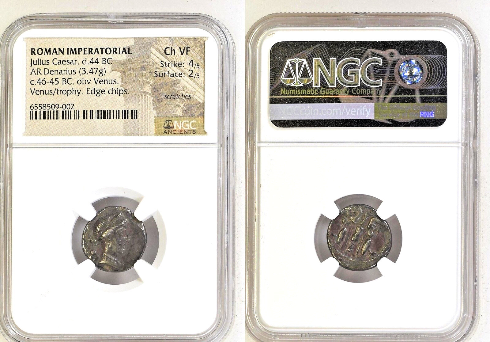 Julius Caesar. 46-45 BC. AR Denarius (3.47 g, 7h). Military mint travelling with Caesar in Spain. Diademed head of Venus right; Cupid behind shoulder / Trophy with oval shield and carnyx (Gallic arms) in each hand between female and male seated captives; CAESAR in exergue. Crawford 468/1; CRI 58; Sydenham 1014; RSC 13. NGC choice VF.