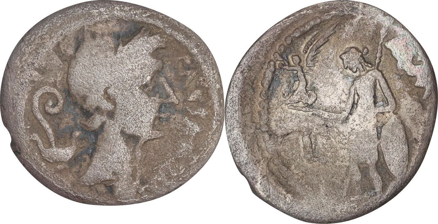 Cr-480/3; CRI-100; Syd-1056; RSC-34. Lifetime issue. Obverse: Wreathed head right; lituus and simpulum to left; Reverse: Venus standing left, holding victoriola and scepter, and resting elbow upon shield set on celestial globus.