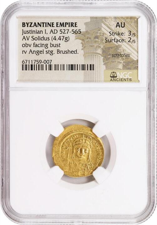 JUSTINIAN I, 527-565. AV Solidus (4.47 gms), Constantinople Mint, 5th Officina, ca. 542-565. NGC AU, Strike: 3/5 Surface: 2/5. Brushed, Scratches.