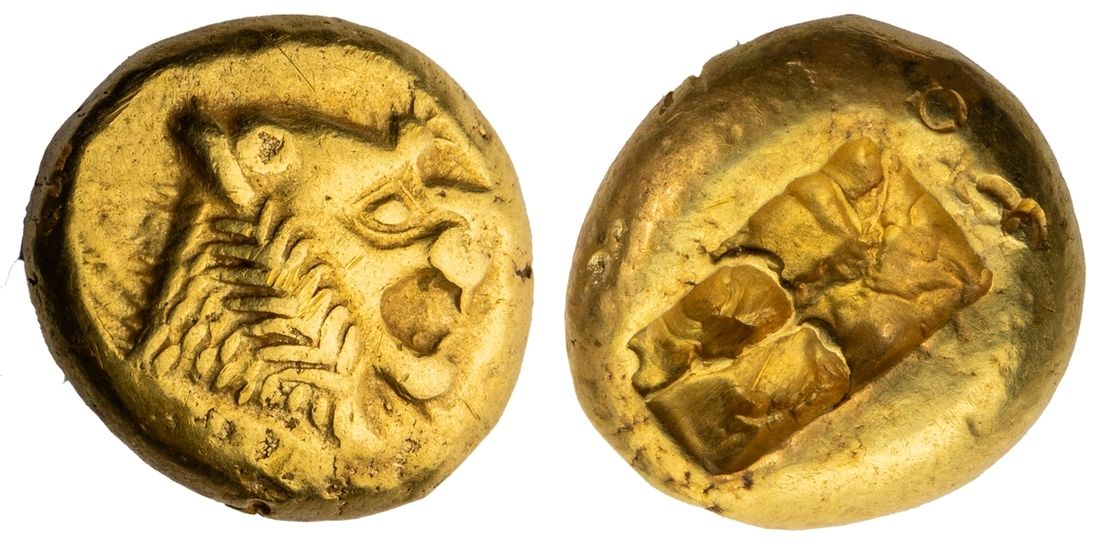 Kingdom of Lydia, Alyattes (c. 610-546 BC), EL Third-Stater or Trite, Sardis, Lydo-Milesian standard, head of lion with sun and rays on its forehead to right, rev. two incuse squares, one larger than the other, 4.73g (SNG Kayhan 1013; SNG von Aulock 2868; Weidauer 86-9), well centred, clearly struck with a bold lion, small banker’s marks to reverse, good very fine or better