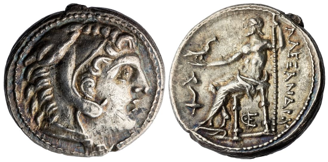 Kingdom of Macedon, Alexander III, ‘the Great’ (336-323 BC), AR Tetradrachm, Amphipolis, struck 315-294 BC, head of Herakles right, wearing lion-skin headdress, rev. ALEXANDPOY, Zeus seated on stool-throne left, holding eagle in outstretched right hand and sceptre in left, Lambda to left, torch below to left, Price monogram 528 beneath throne, consisting of Theta and Epsilon, 17.14g (Price 463), edge bur at 12 o’clock and crack at 6 o’clock, iridescent toning, very fine