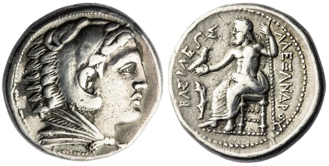 Kingdom of Macedon, Alexander III, ‘the Great’ (336-323 BC), AR Tetradrachm, struck 323-320, beardless head of Herakles right, wearing lion-skin headdress, rev. BASILEWS ALEXANDPOY, Zeus seated left on stool-throne, holding eagle in outstretched right hand and sceptre in left, bow and quiver to left, 17.09g (Price 110), toned, about very fine