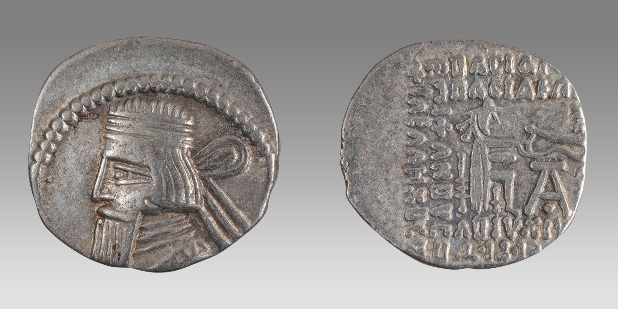 KINGS of PARTHIA. Vardanes I. Circa AD 38-46. AR Drachm (20mm, 3.66 g, 12h). Ekbatana mint. Diademed bust left / Archer (Arsakes I) seated right on throne, holding bow; monogram below bow. Sellwood 64.31; Sunrise 414; Shore 353. toned. VF.