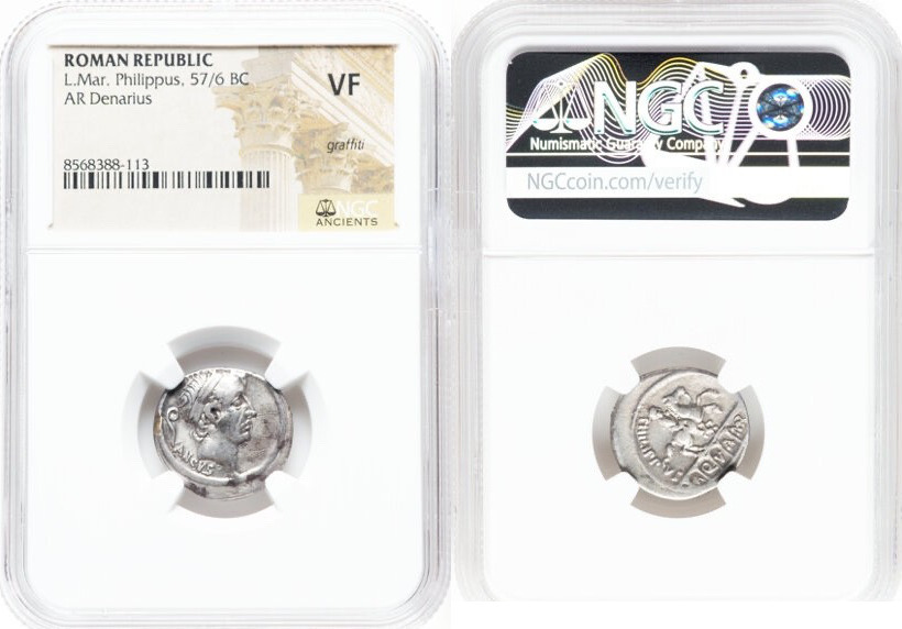 L. Marcius Philippus (57/6 BC). AR denarius (19mm, 10h). NGC VF, graffiti. Rome. ANCVS, diademed head of King Ancus Marcius right; lituus behind / PHILIPP-VS, equestrian statue prancing right on aqueduct arcade of five arches; flower (splash of water?) below horse; A-Q-V-A-MAR (MAR ligate) within arches. Crawford 425/1. Sydenham 919. Marcia 28. Crawford (56 BC). Hersh/Walker (57 BC).