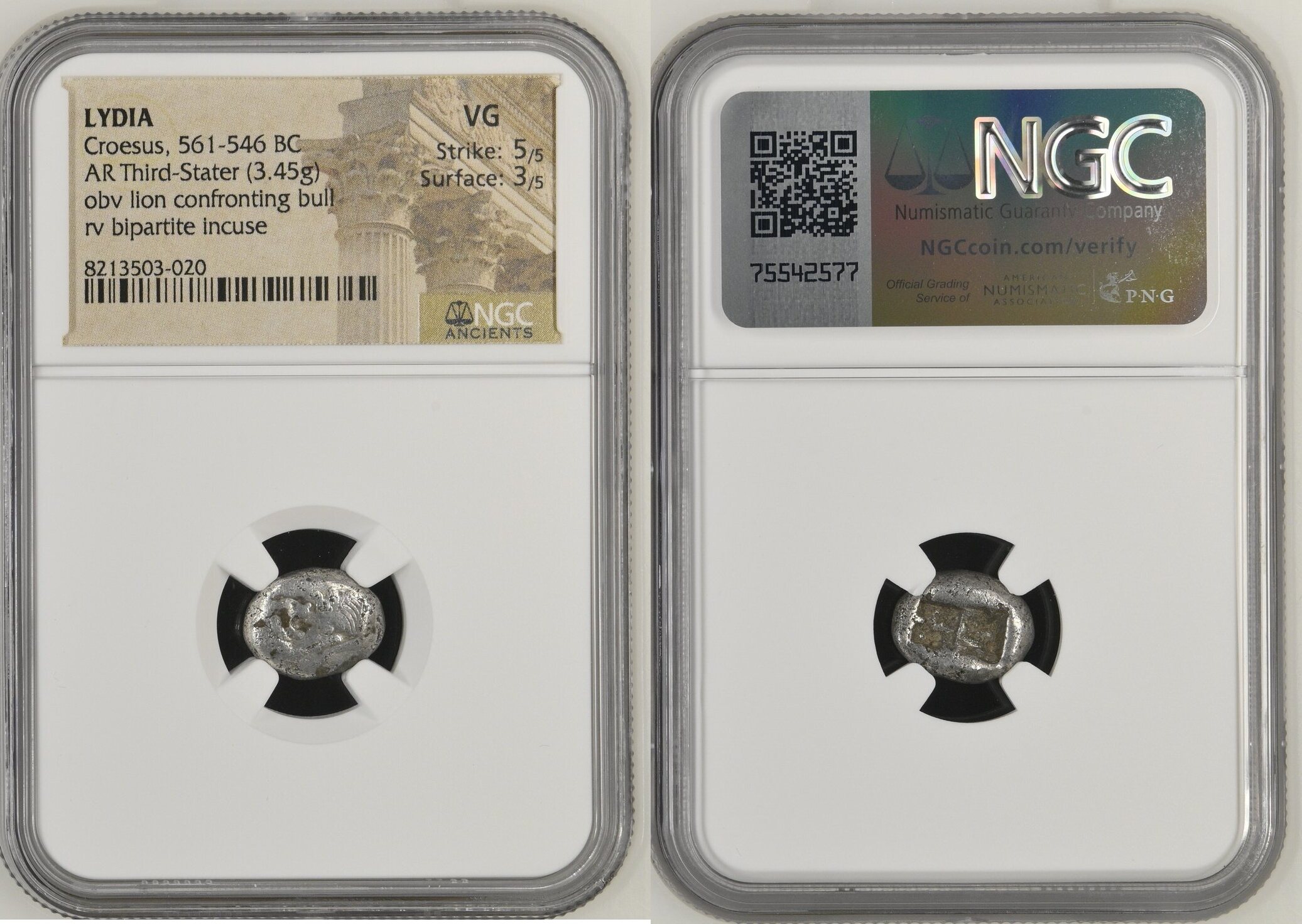 LYDIAN KINGDOM. Croesus (561-546 BC). AR third-stater (13mm, 3.45 gm). NGC VG 5/5 – 3/5. Croeseid standard, Sardes. Confronted foreparts of lion facing right and bull facing left, each with outstretched forelegs / Two square punches side by side, irregular interior surfaces. Rosen 666. BMFA 2071. SNG Keckman 359.