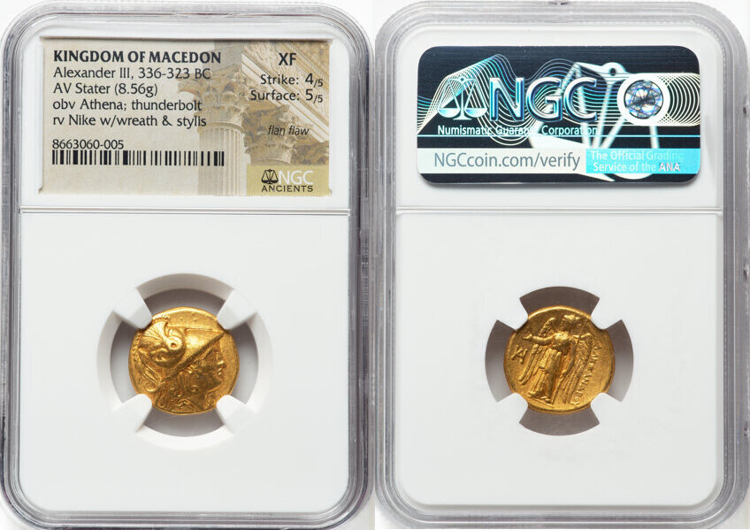 MACEDONIAN KINGDOM. Alexander III the Great (336-323 BC). AV stater (17mm, 8.56 gm, 1h). NGC XF 4/5 – 5/5, flan flaw. Lifetime issue, Miletus, ca. 325-323 BC. Head of Athena right, hair flowing loose and over left shoulder, wearing triple-crested Corinthian helmet pushed back on head, short intersecting crest ends, bowl decorated with coiled serpent right; thunderbolt below truncation / AΛEΞANΔPOY, Nike standing facing, head left, wreath in outstretched right hand, stylis cradled in left arm; HΔ monogram in left field. Price 2077.