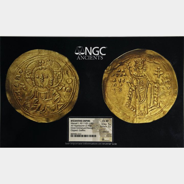 MANUEL I, 1143-1180. AV Hyperpyron (2.96 gms), Constantinople Mint 1152-1160. NGC Ch EF, Strike: 5/5 Surface: 2/5. Clipped, Graffito, Wrinkled.